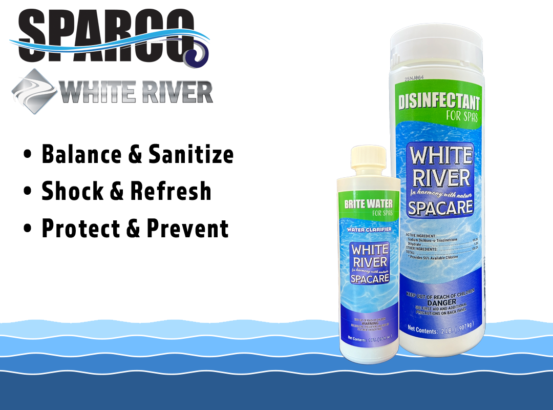Introducing White River Spa Care, SPARCO’s dedicated line of spa care and maintenance products designed to keep your hot tub water clean, clear, and perfectly balanced. Crafted for performance and ease of use, White River Spa Care helps you protect your investment while enhancing every soak with fresh, comfortable water. From sanitizers and balancers to specialty treatments, trust White River to deliver reliable, spa-ready results—so all you have to do is relax.